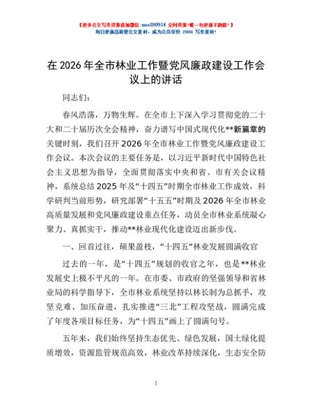 / 在2026年全市林业工作暨党风廉政建设工作会议上的讲话