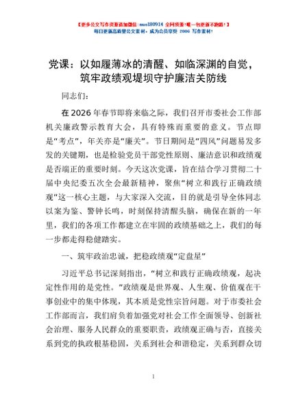 党课:以如履薄冰的清醒、如临深渊的自觉,筑牢政绩观堤坝守护廉洁关防线