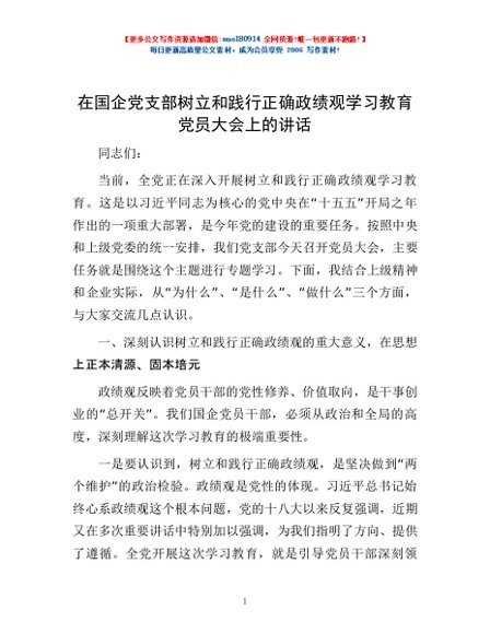 / 在国企党支部树立和践行正确政绩观学习教育党员大会上的讲话