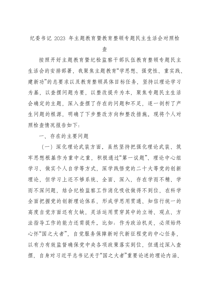 / 纪委书记主题教育暨教育整顿专题民主生活会对照检查3900字(五个方面版)