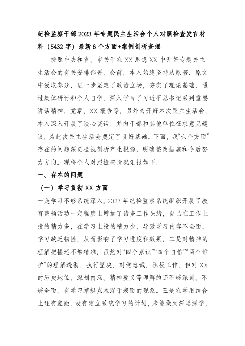 / 纪检监察干部2023年专题民主生活会个人对照检查发言材料(践行宗旨等6个方面+案例剖析查摆