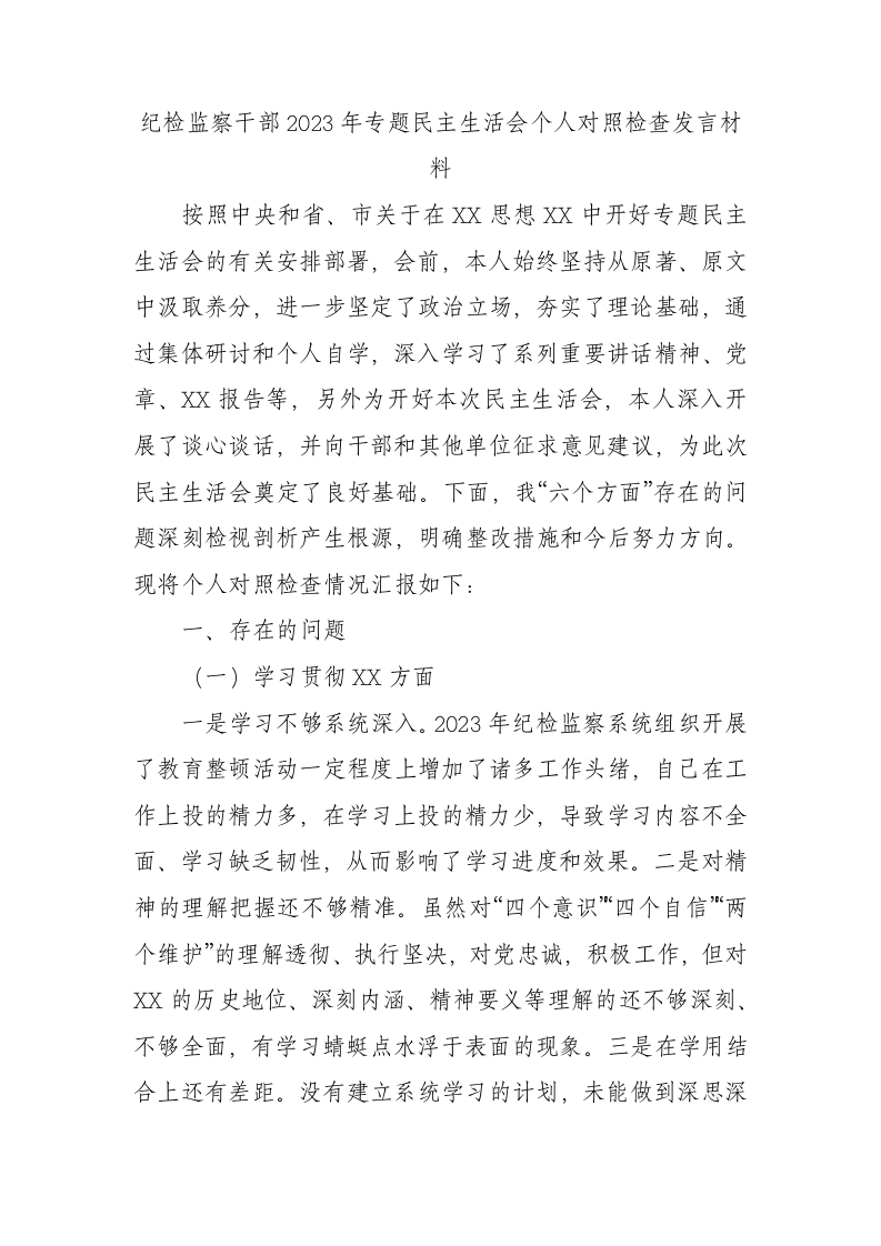 / 纪检监察干部2023年专题民主生活会个人对照检查发言材料