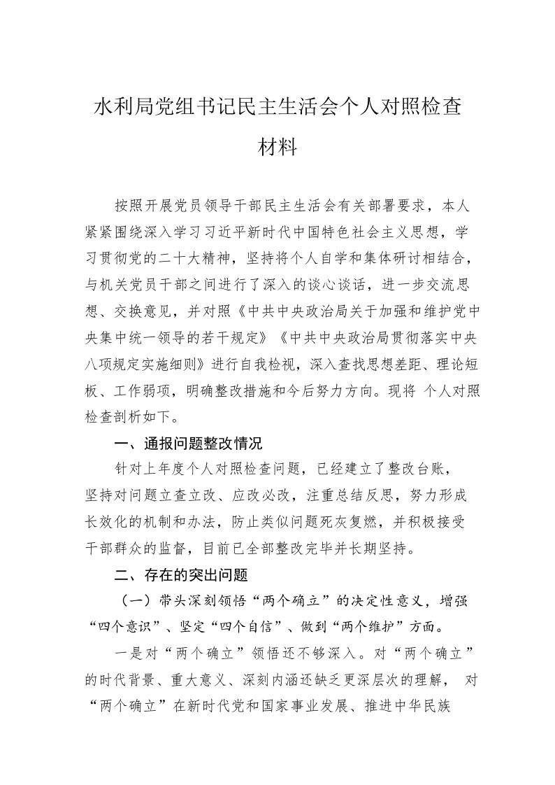 / 2022年度水利局党组书记民主生活会个人对照检查材料