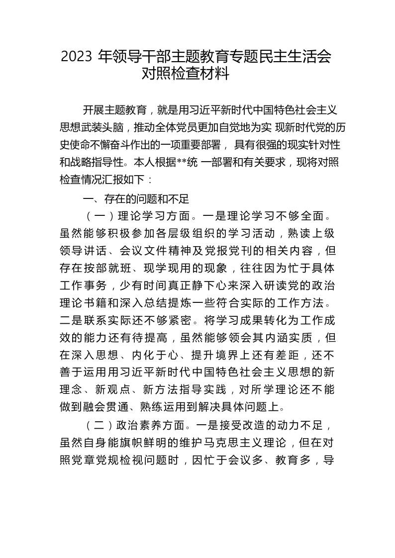 / 2023年领导干部主题教育专题民主生活会对照检查材料
