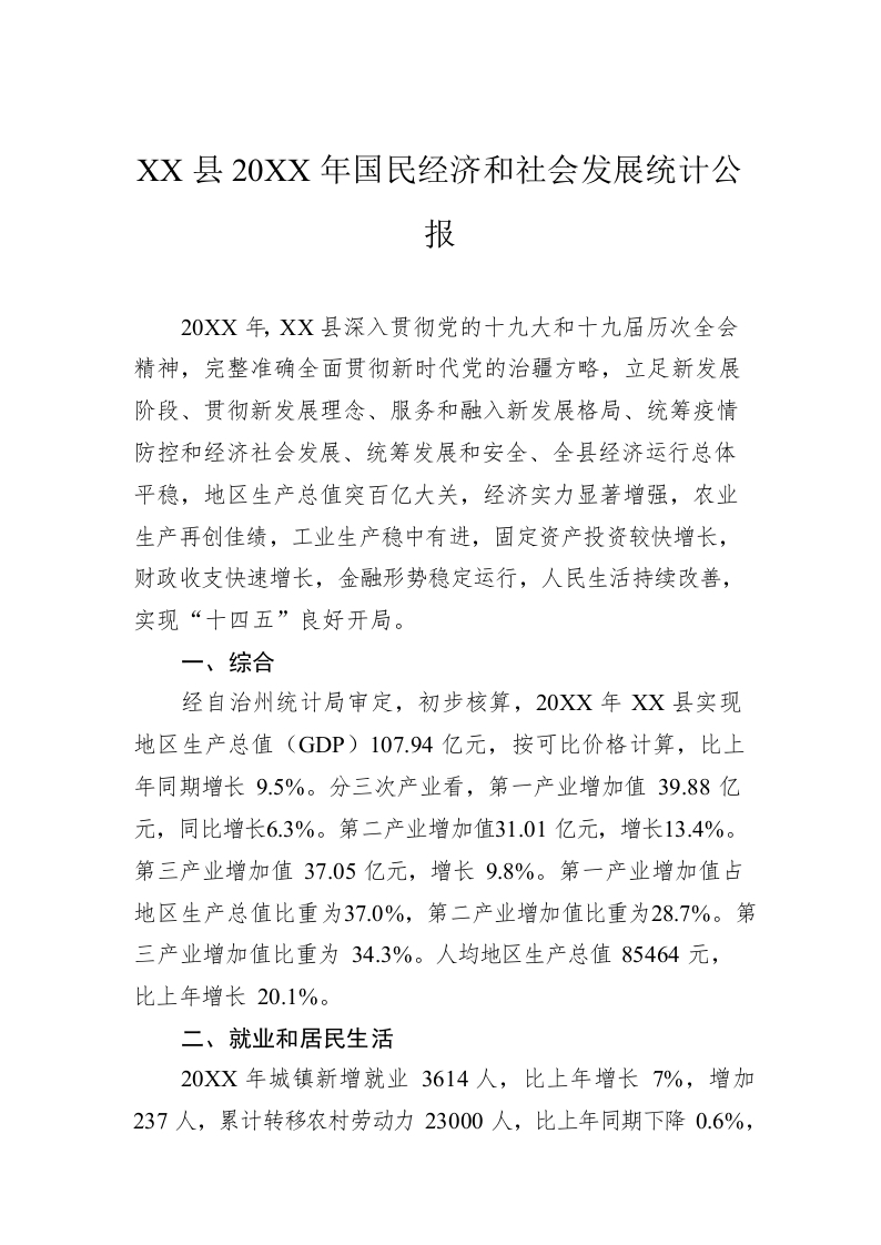 / XX县20XX年国民经济和社会发展统计公报(20220531)
