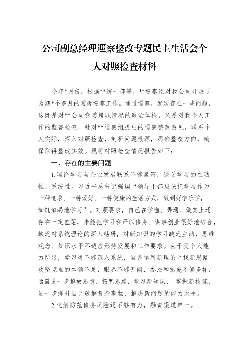 / 公司副总经理巡察整改专题民主生活会个人对照检查材料