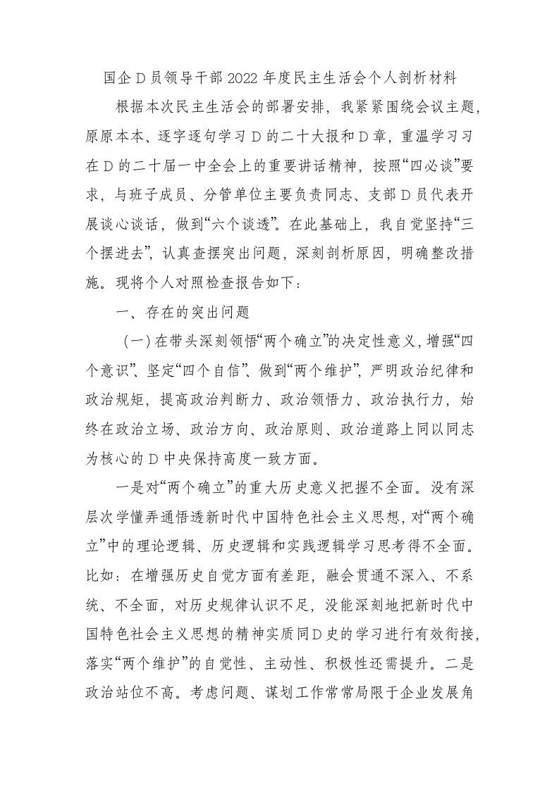 / 国企党员领导干部XX年度民主生活会个人剖析材料