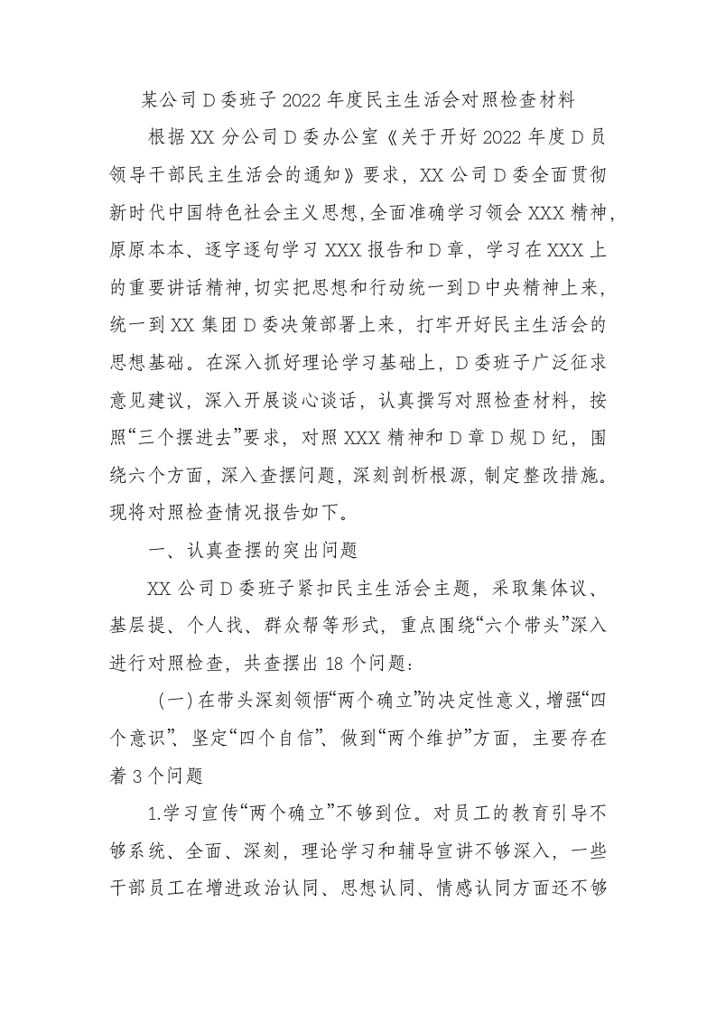 / 某公司党委班子XX年度民主生活会对照检查材料
