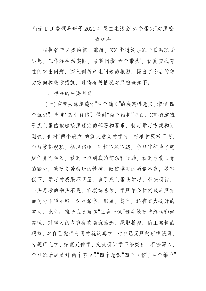街道党工委领导班子XX年民主生活会“六个带头”对照检查材料