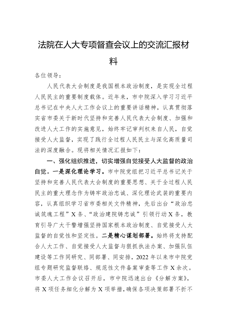 / 法院在人大专项督查会议上的交流汇报材料