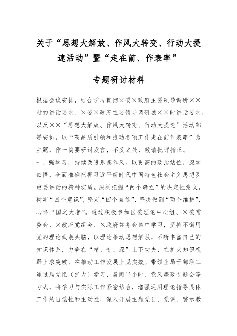 / 关于“思想大解放、作风大转变、行动大提速活动”暨“走在前、作表率”专题研讨材料