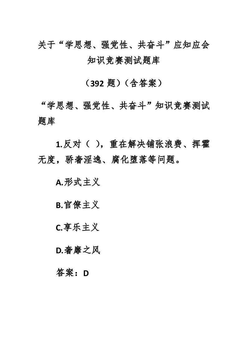 / (392题)关于“学思想、强党性、共奋斗”应知应会知识竞赛测试题库(含答案)