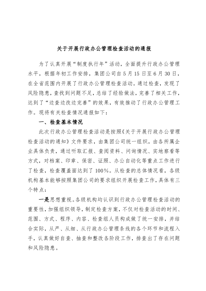 关于开展行政办公管理检查活动的通报