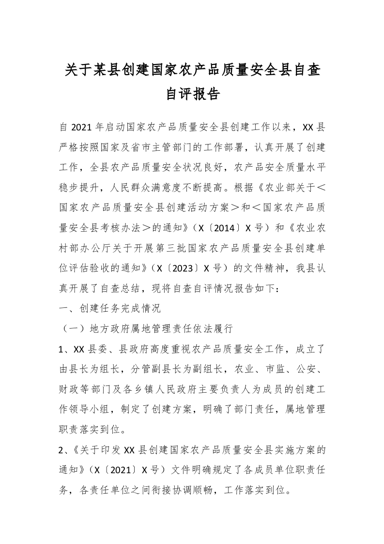 / 关于某县创建国家农产品质量安全县自查自评报告