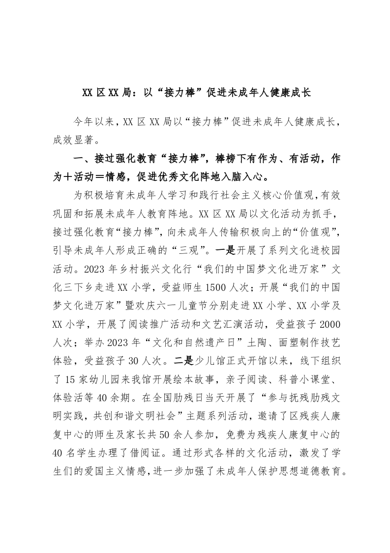 / XX区XX局:以“接力棒”促进未成年人健康成长