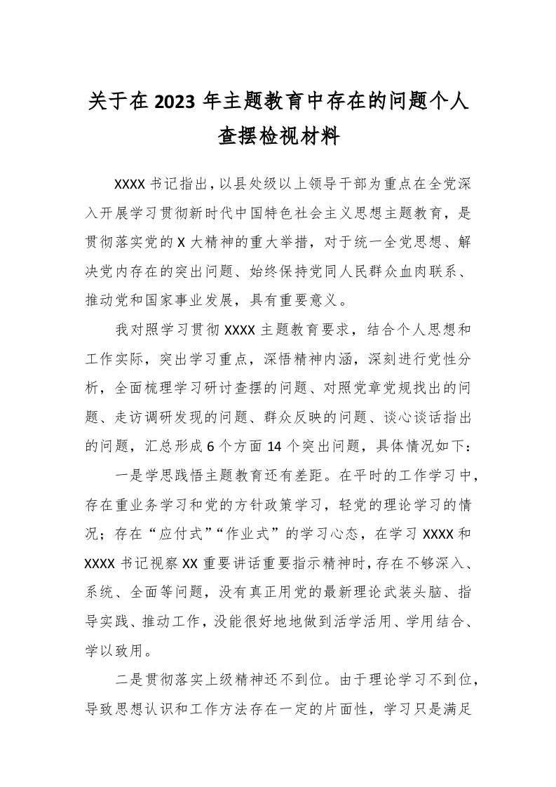 / 关于在2023年主题教育中存在的问题个人查摆检视材料