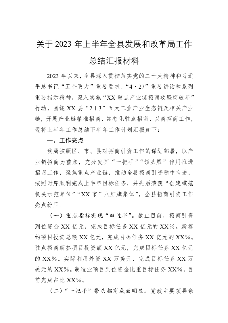 / 关于2023年上半年全县发展和改革局工作总结汇报材料
