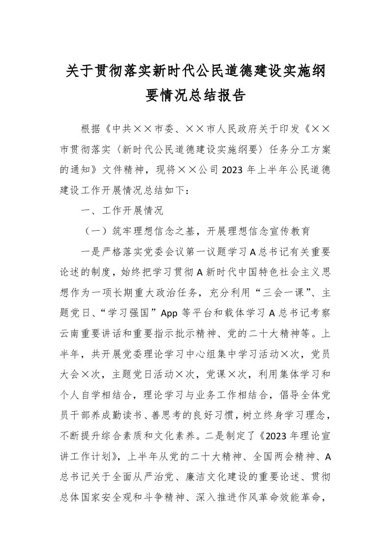 / 关于贯彻落实新时代公民道德建设实施纲要情况总结报告