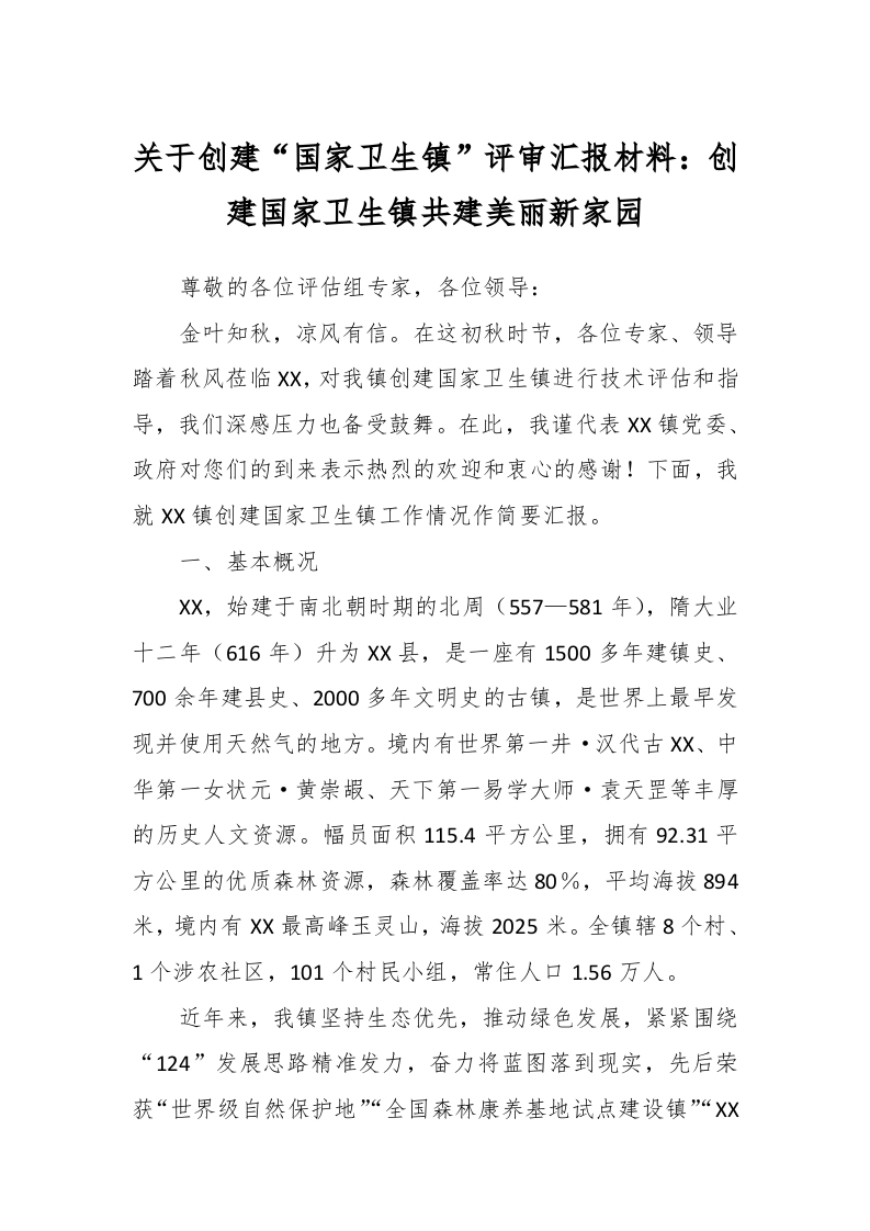 / 关于创建“国家卫生镇”评审汇报材料:创建国家卫生镇共建美丽新家园