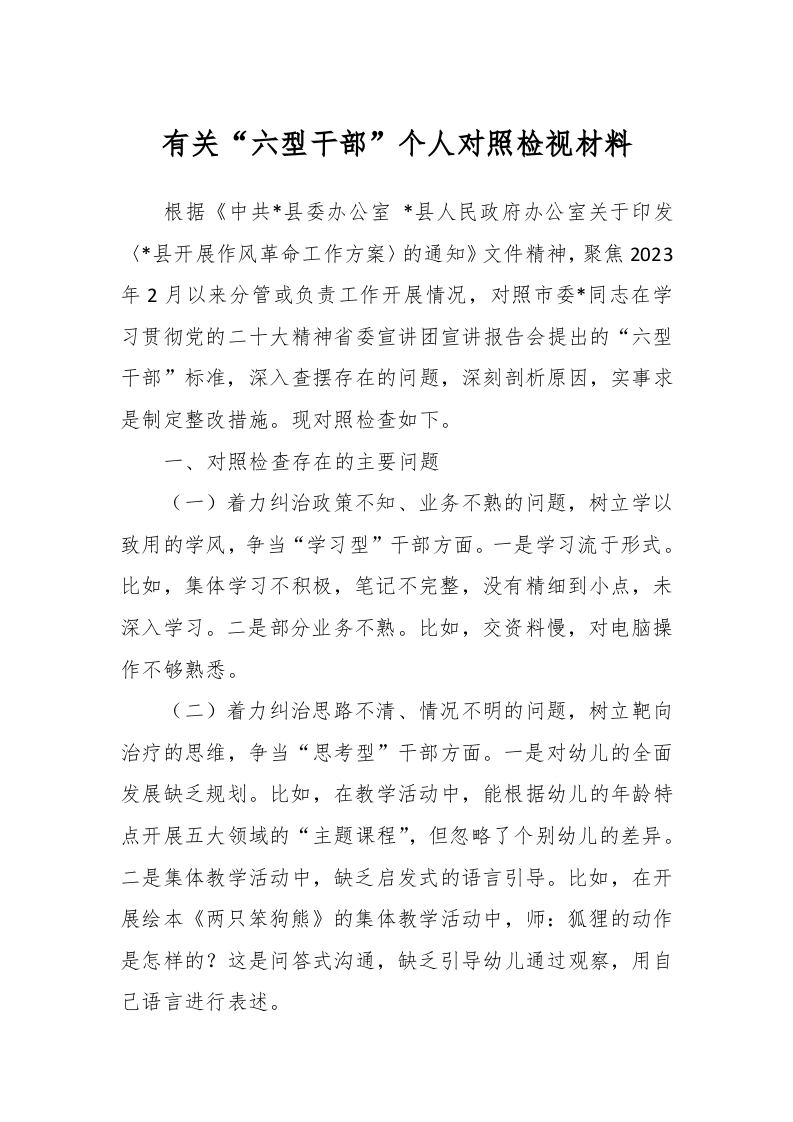 / 有关“六型干部”个人对照检视材料