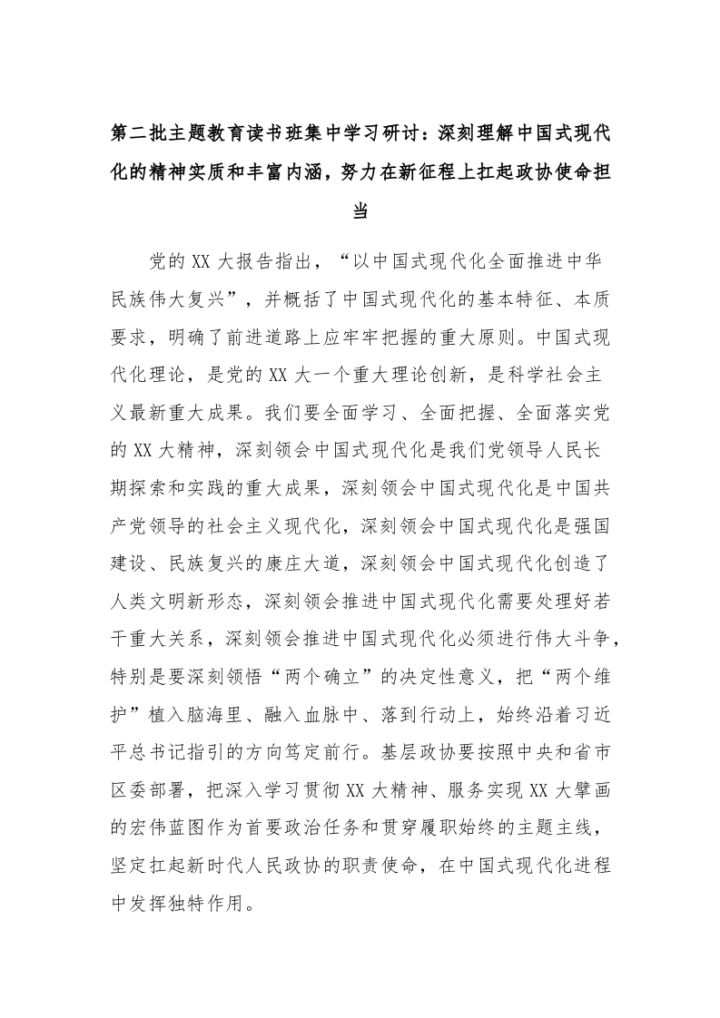 / 第二批主题教育读书班集中学习研讨:深刻理解中国式现代化的精神实质和丰富内涵,努力在新征程上扛起政协使命担当