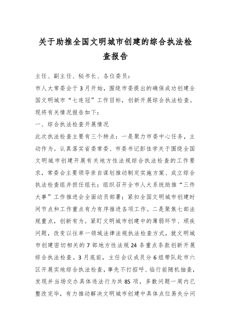 / 关于助推全国文明城市创建的综合执法检查报告