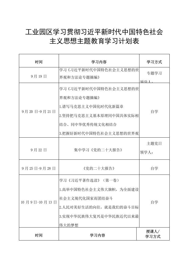 / 工业园区学习贯彻习近平新时代中国特色社会主义思想主题教育学习计划表