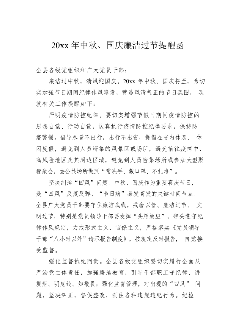 / 20xx年中秋、国庆廉洁过节提醒函