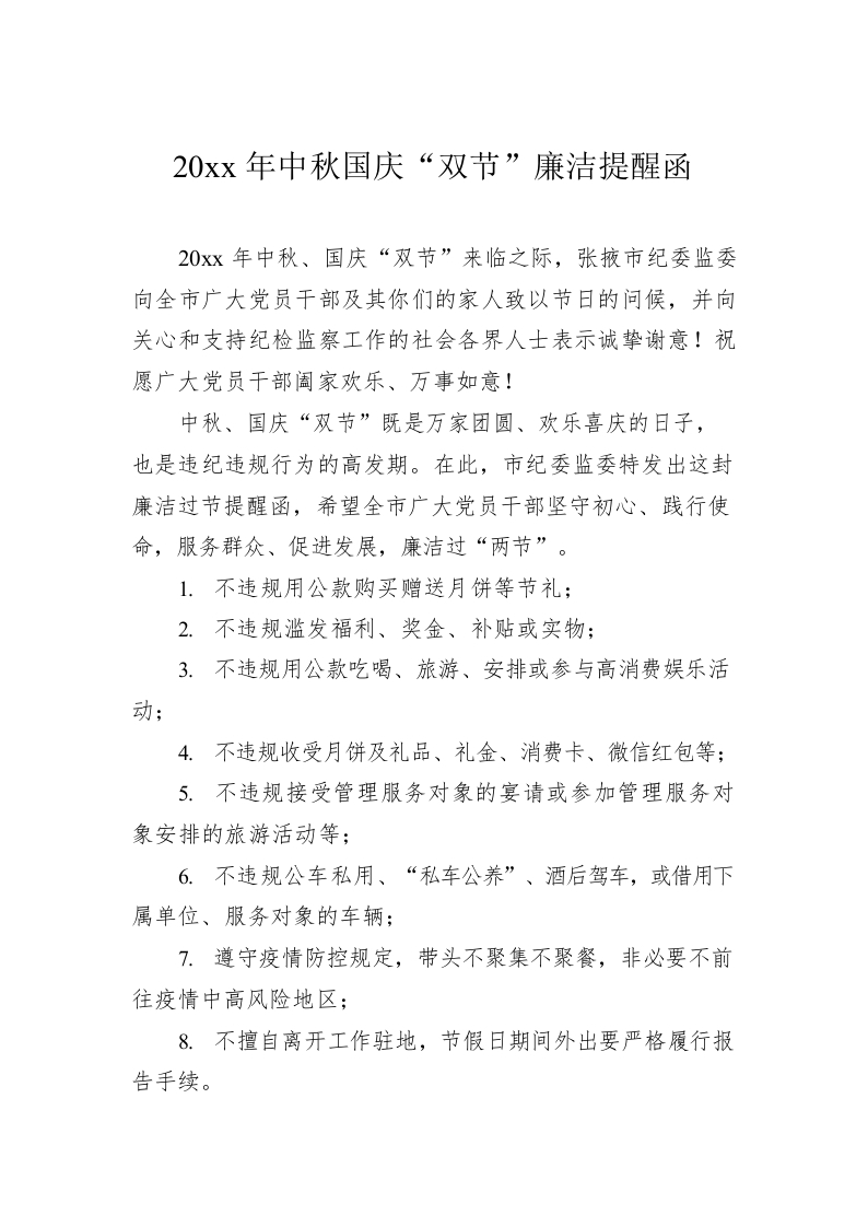 / 20xx年中秋国庆“双节”廉洁提醒函