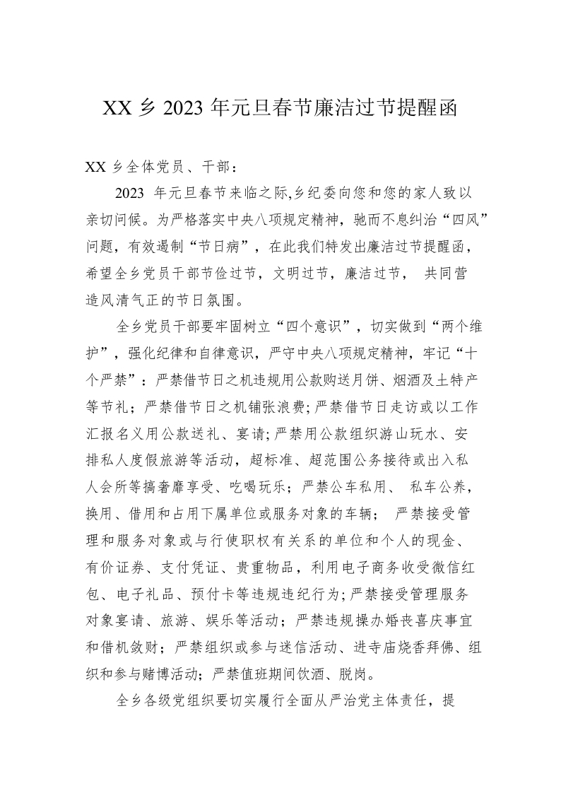 / XX乡2023年元旦春节廉洁过节提醒函(20221231)