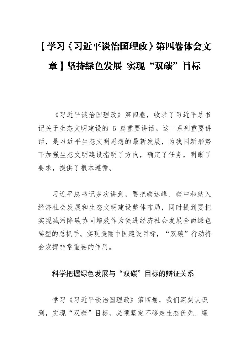 / 【学习《习近平谈治国理政》第四卷体会文章】坚持绿色发展 实现“双碳”目标