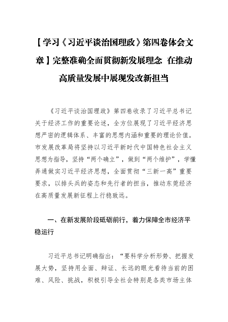 / 【学习《习近平谈治国理政》第四卷体会文章】完整准确全面贯彻新发展理念 在推动高质量发展中展现发改新担当