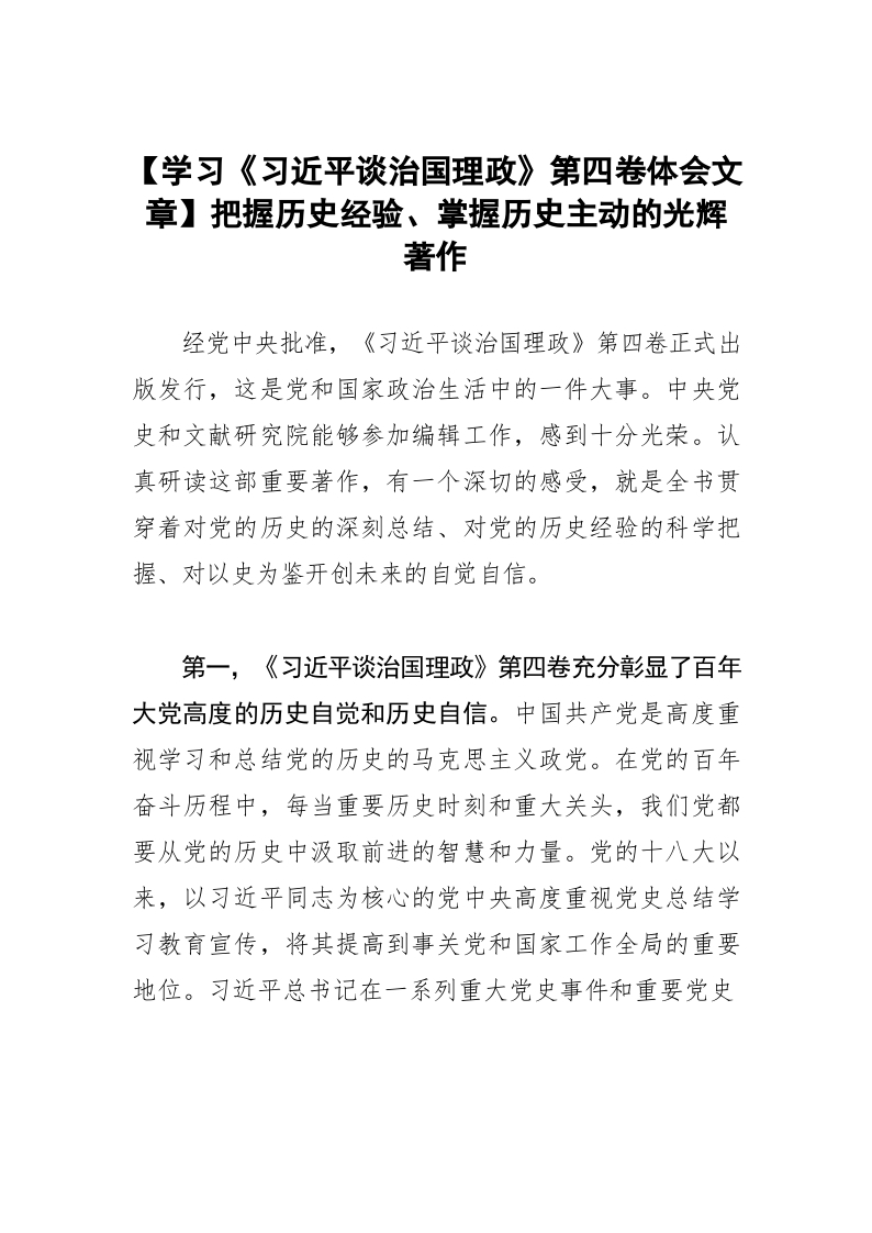 / 【学习《习近平谈治国理政》第四卷体会文章】把握历史经验、掌握历史主动的光辉著作