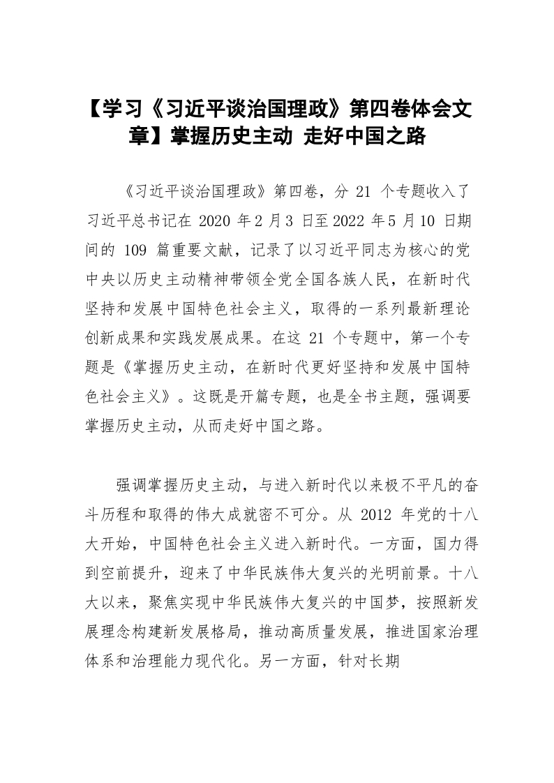 / 【学习《习近平谈治国理政》第四卷体会文章】掌握历史主动 走好中国之路