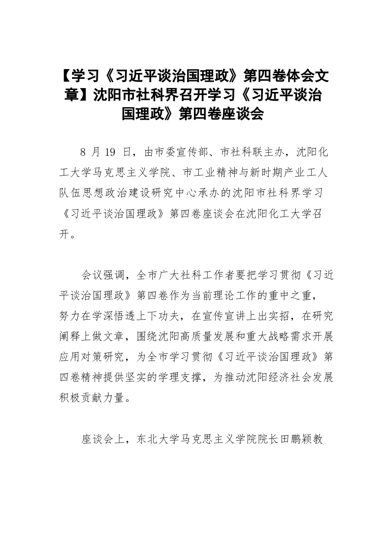 / 【学习《习近平谈治国理政》第四卷体会文章】沈阳市社科界召开学习《习近平谈治国理政》第四卷座谈会
