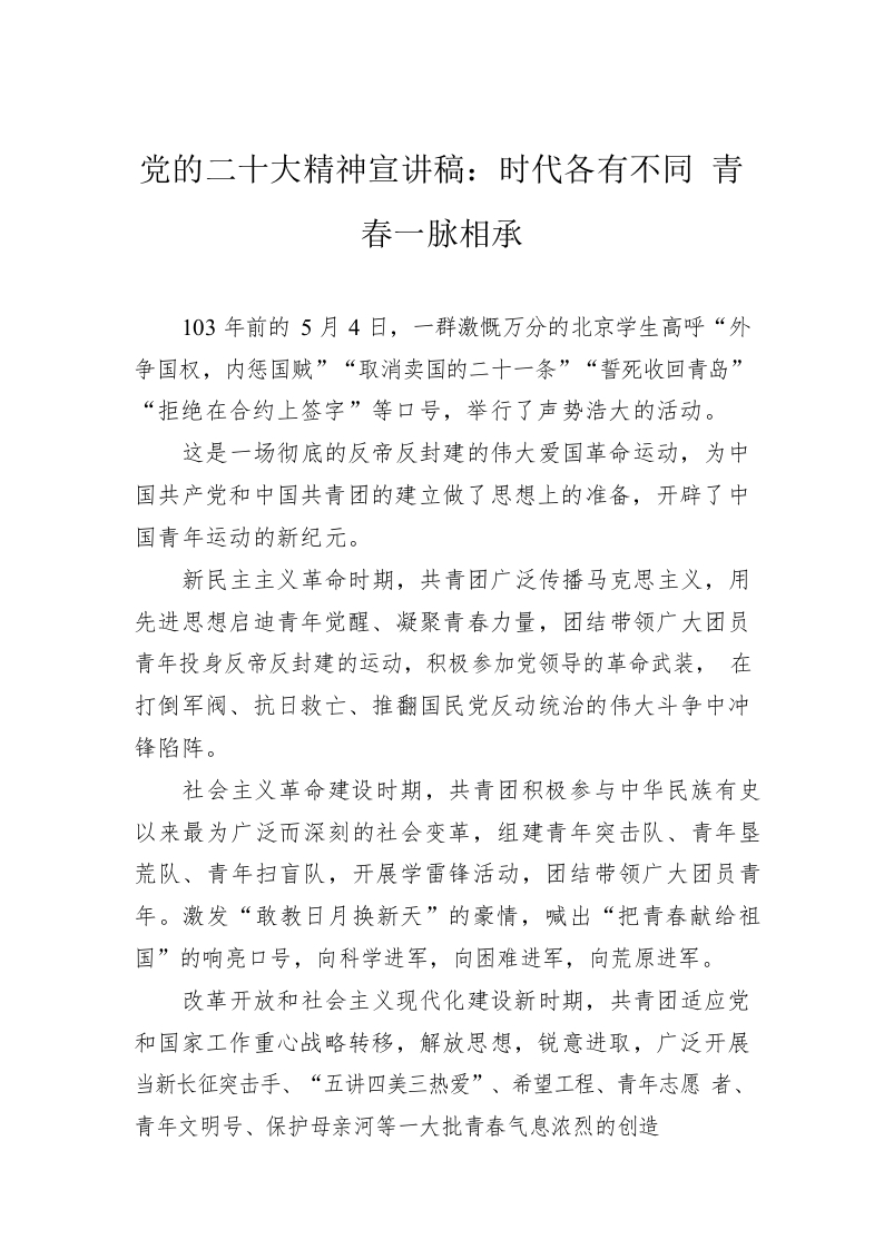 党的二十大精神宣讲稿:时代各有不同 青春一脉相承(20221226)