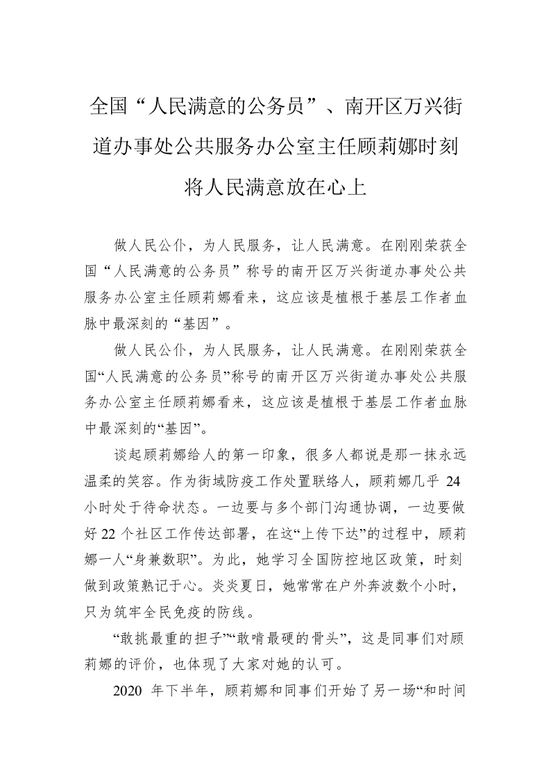 / 全国“人民满意的公务员”、南开区万兴街道办事处公共服务办公室主任顾莉娜时刻将人民满意放在心上(20220915)