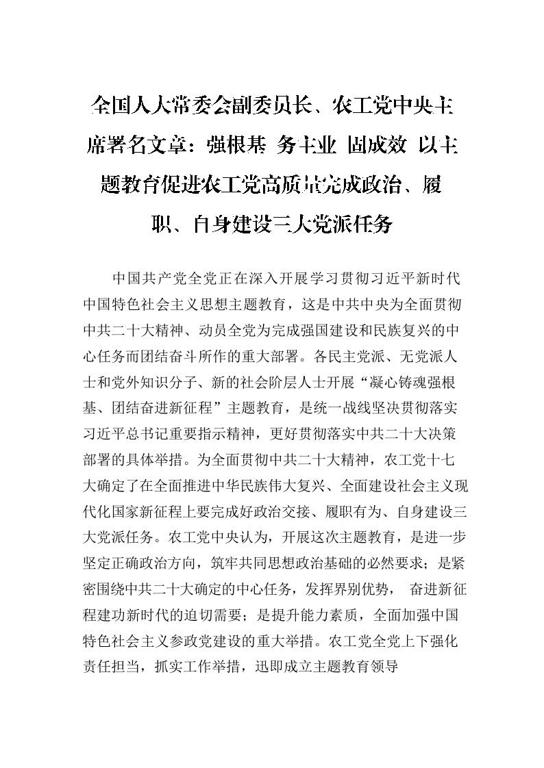 全国人大常委会副委员长、农工党中央主席署名文章:强根基 务主业 固成效 以主题教育促进农工党高质量完成政治、履职、自身建设三大党派任务