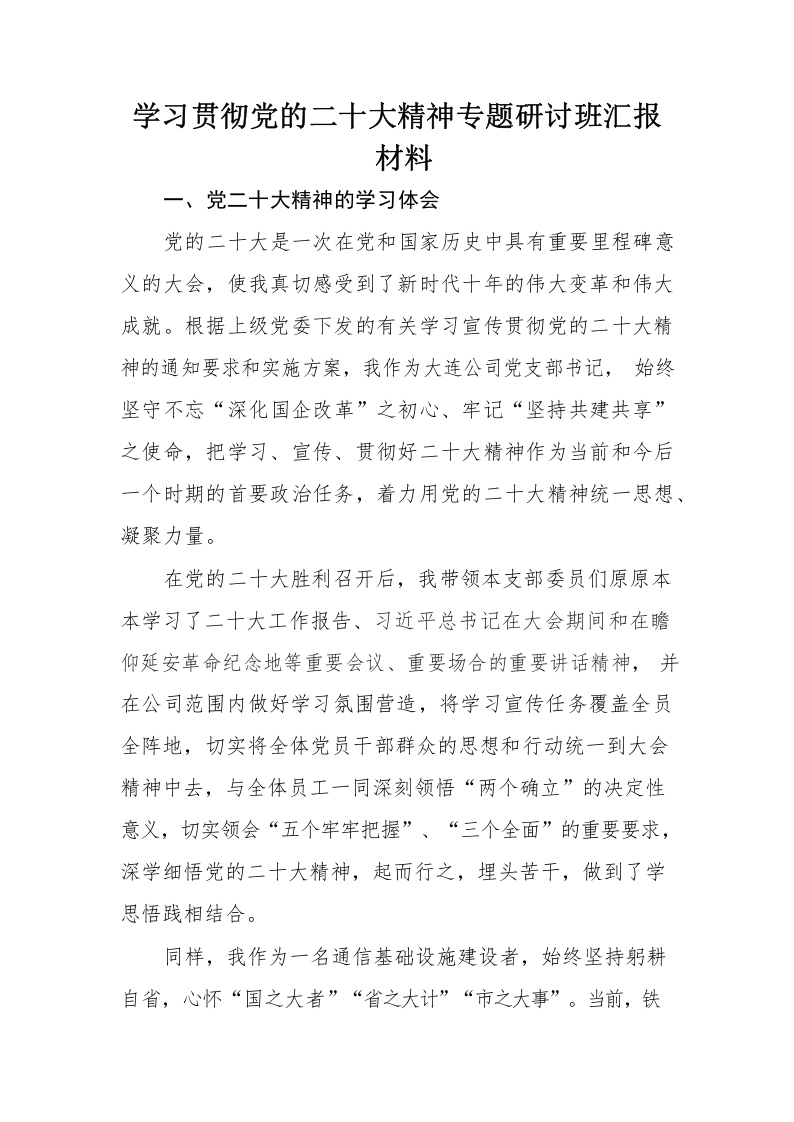 / 学习贯彻党的二十大精神专题研讨班汇报材料