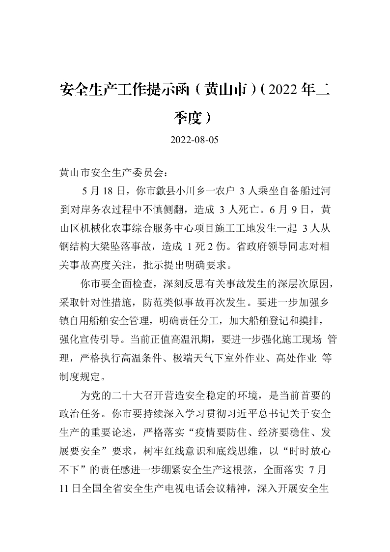 / 安全生产工作提示函(XX市)(2022年二季度)