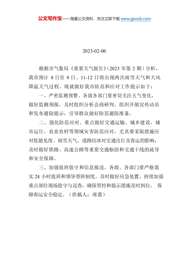 / 安阳市人民政府低温雨雪冰冻灾害应急指挥部办公室关于做好近期雨雪天气防范应对工作的提示函