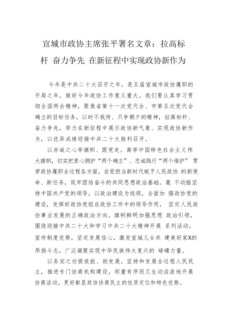 / 宣城市政协主席张平署名文章:拉高标杆 奋力争先 在新征程中实现政协新作为(20220331)