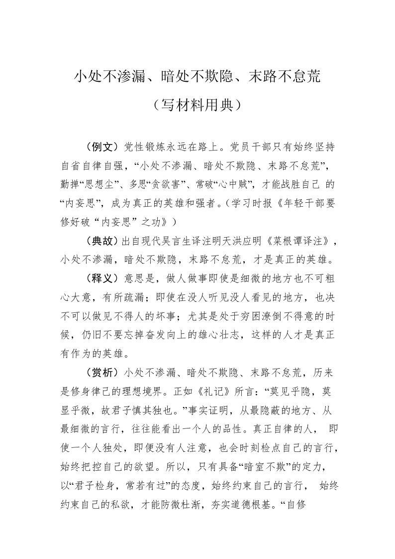 / 小处不渗漏、暗处不欺隐、末路不怠荒(写材料用典)