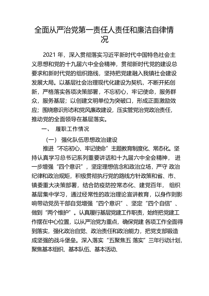 履行全面从严治党第一责任人责任和廉洁自律情况