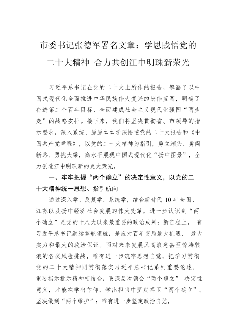 / 市委书记张德军署名文章:学思践悟党的二十大精神 合力共创江中明珠新荣光(20221127)