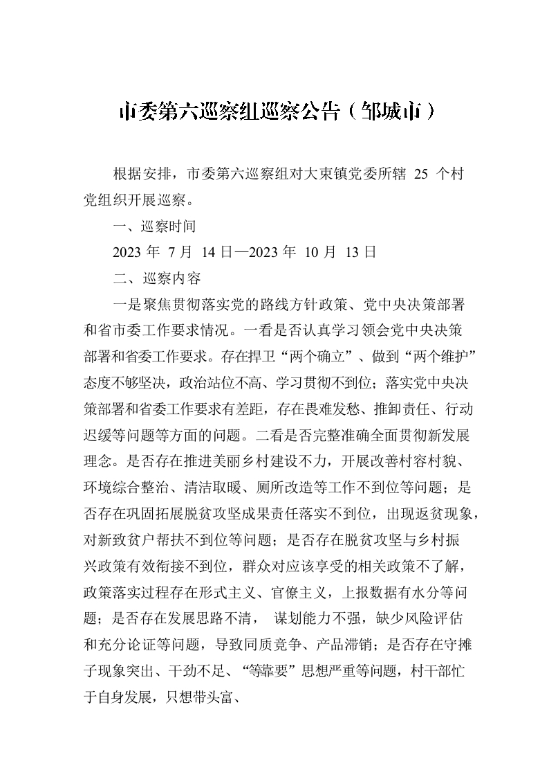 / 市委第六巡察组巡察公告(邹城市)