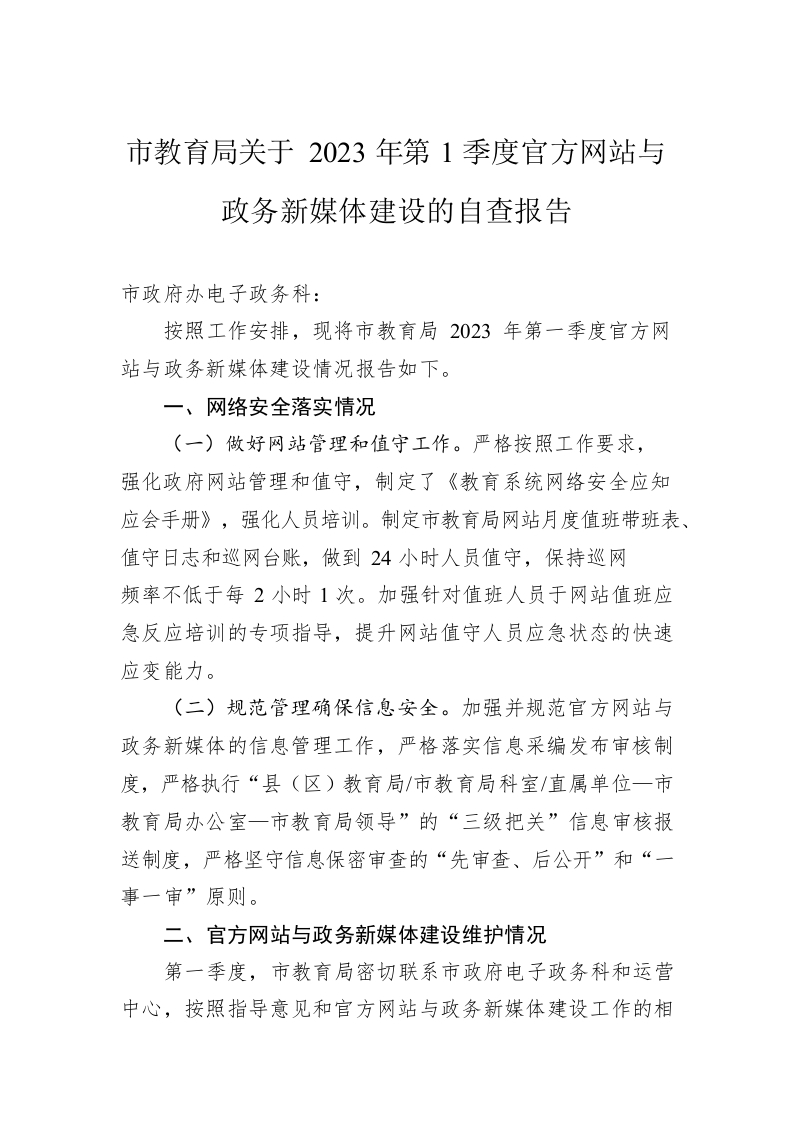 / 市教育局关于2023年第1季度官方网站与政务新媒体建设的自查报告(20230227)