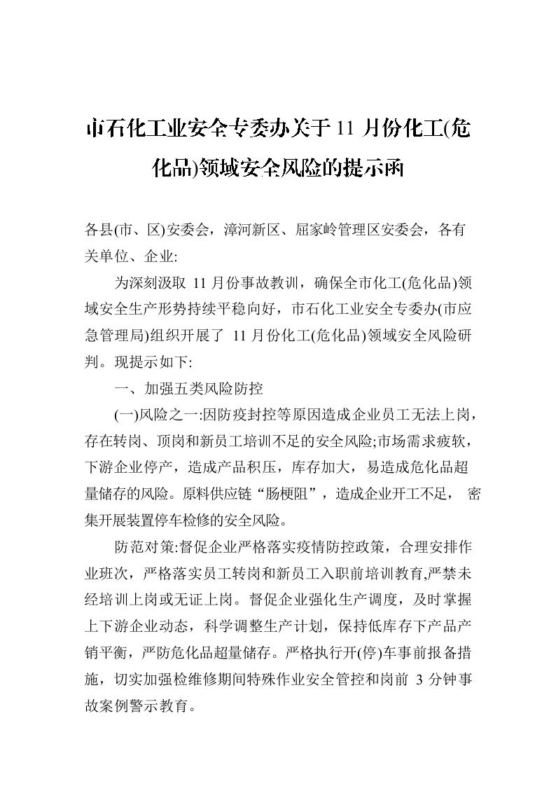/ 市石化工业安全专委办关于11月份化工(危化品)领域安全风险的提示函