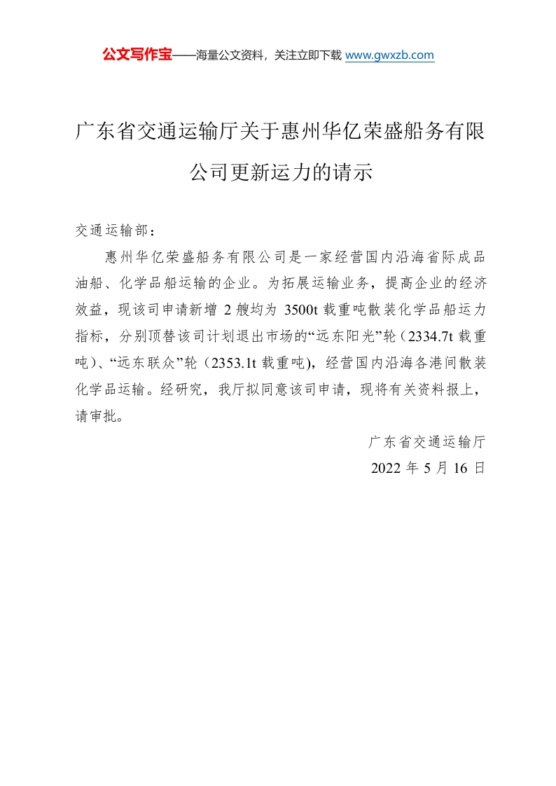 / 广东省交通运输厅关于惠州华亿荣盛船务有限公司更新运力的请示