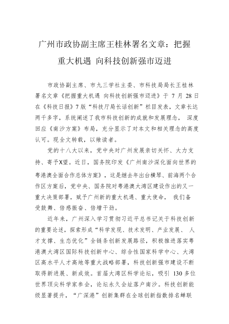 / 广州市政协副主席王桂林署名文章:把握重大机遇 向科技创新强市迈进(20220801)